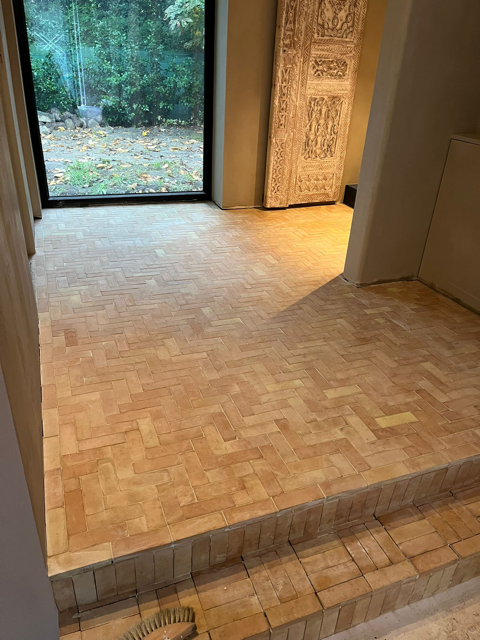 De vloer van dit poolhouse is afgewerkt met bejmats "brut naturel". Deze handgevormde terracotta tegels hebben een lichte variatie in kleur en textuur, wat zorgt voor een natuurlijke en authentieke uitstraling. Perfect geschikt voor warme, zuiderse sferen – binnen én buiten.