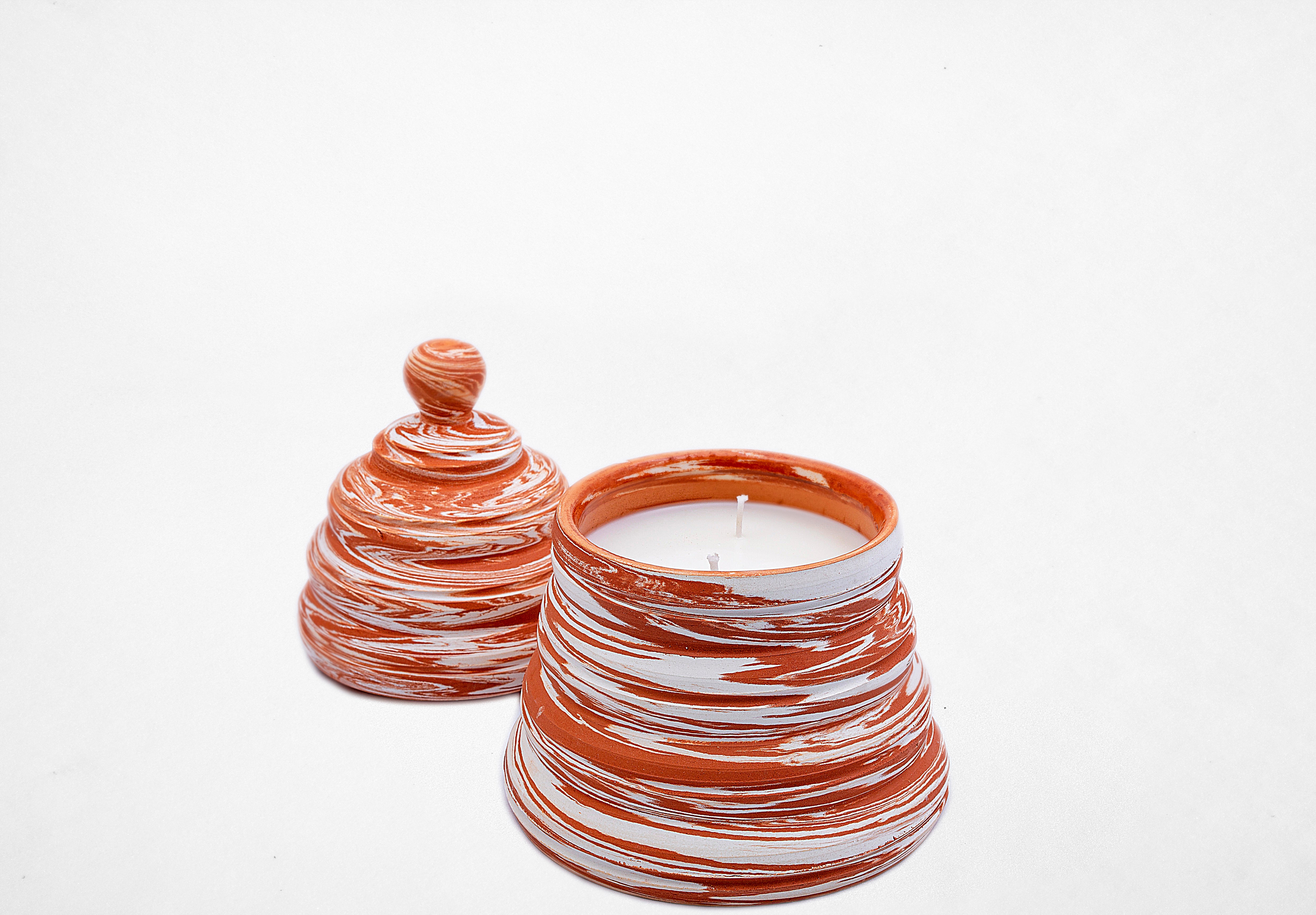 Deze geurkaars is een karakterstuk dat warmte en vakmanschap samenbrengt. De pot is vervaardigd uit terracotta en met de hand gevormd voor een warme, decoratieve uitstraling.