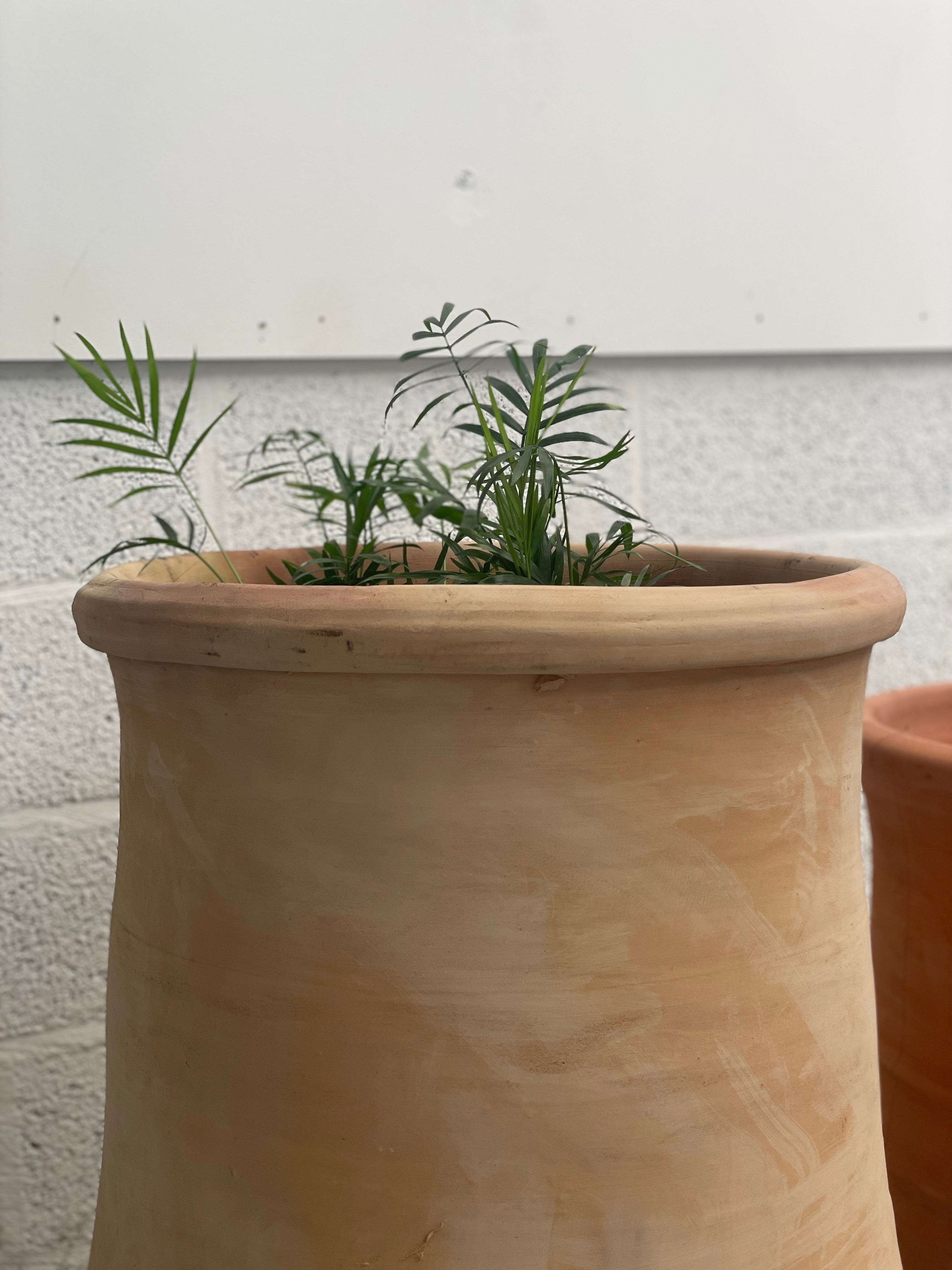 Traditionele Marokkaanse potten uit natuurlijke rode klei. In een houtoven krijgen ze een zachtere, rozige tint; in een gasoven een diepere terracotta kleur. Elke pot is handgemaakt, waardoor vorm en kleur subtiel verschillen.