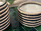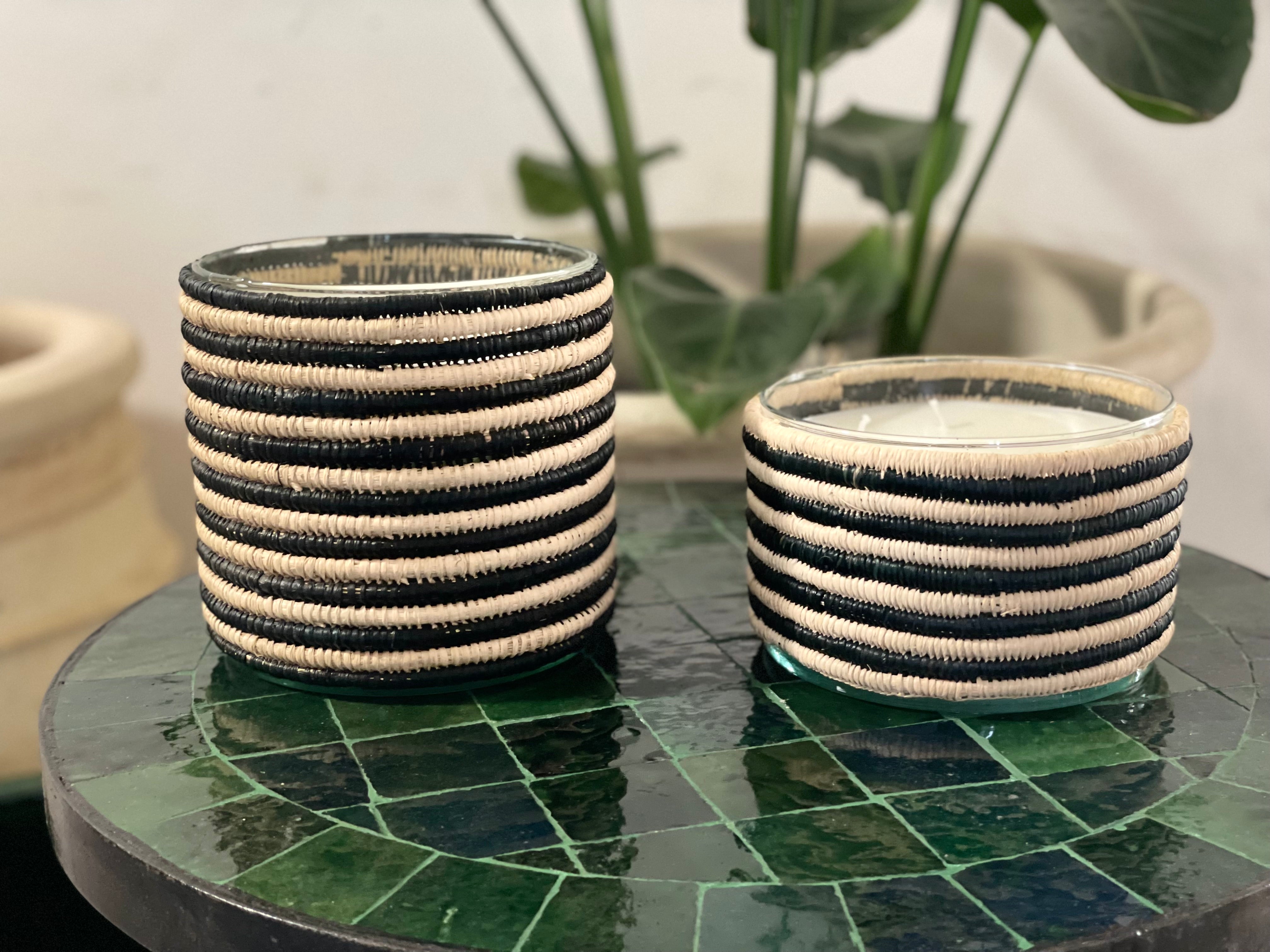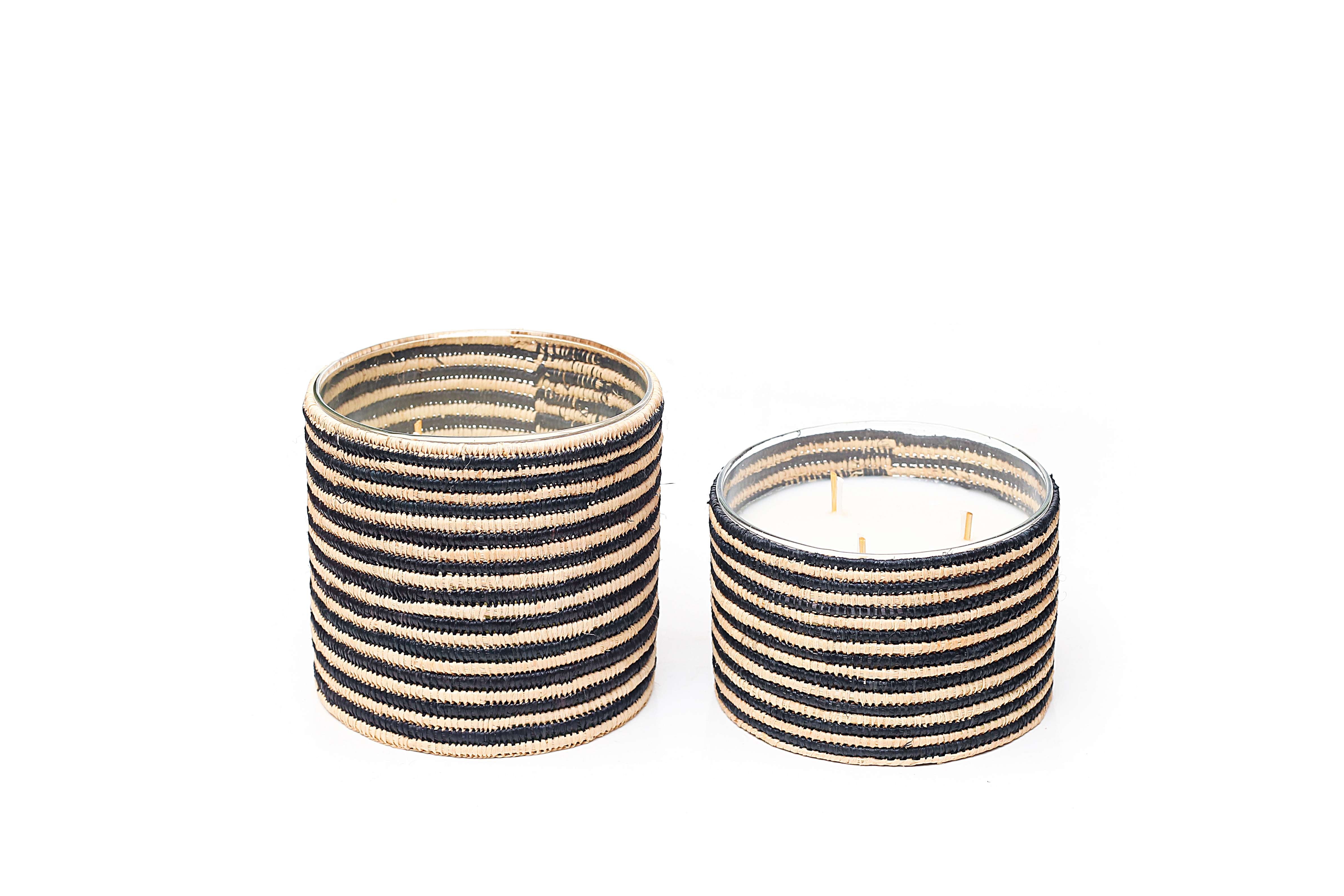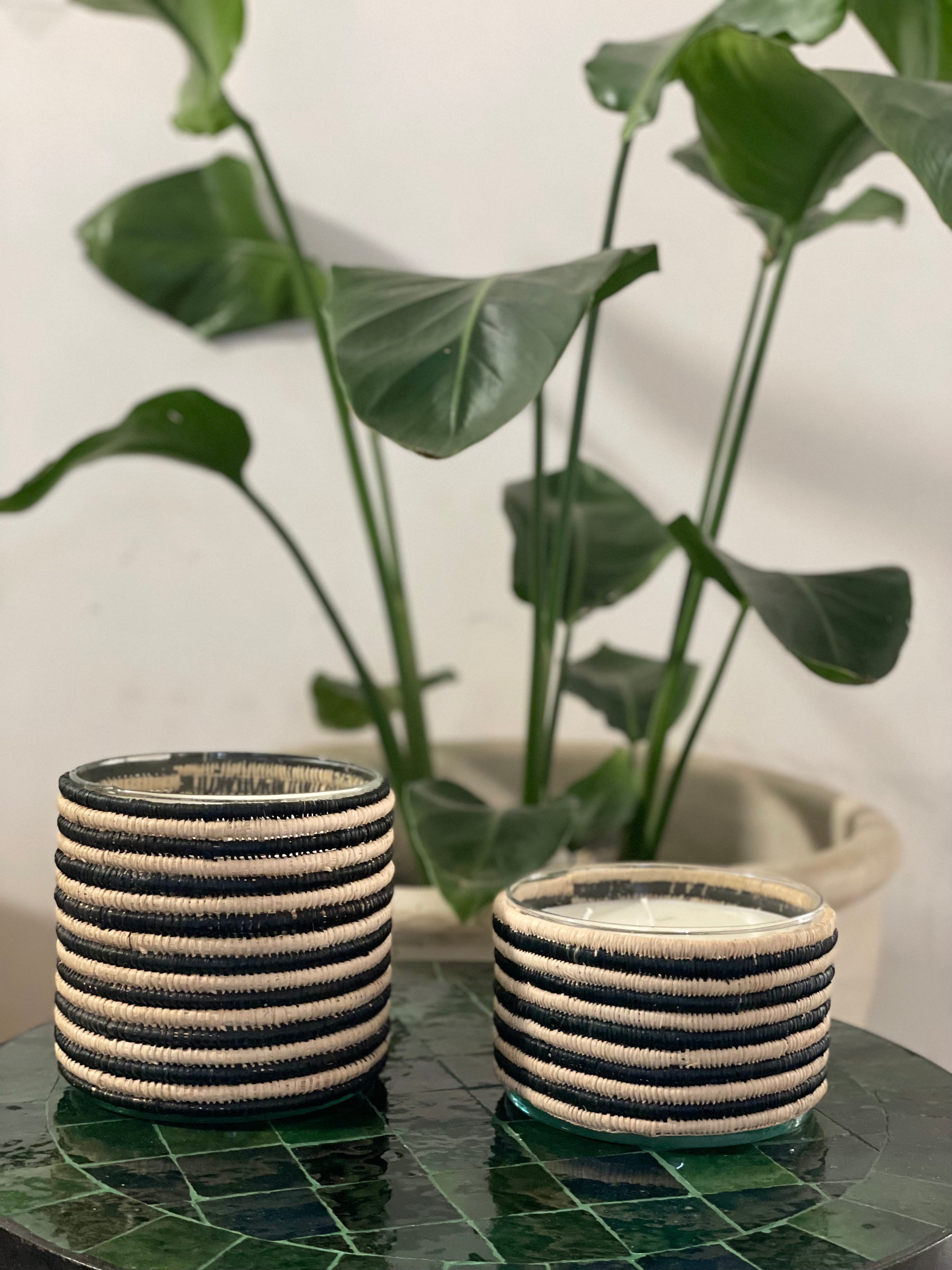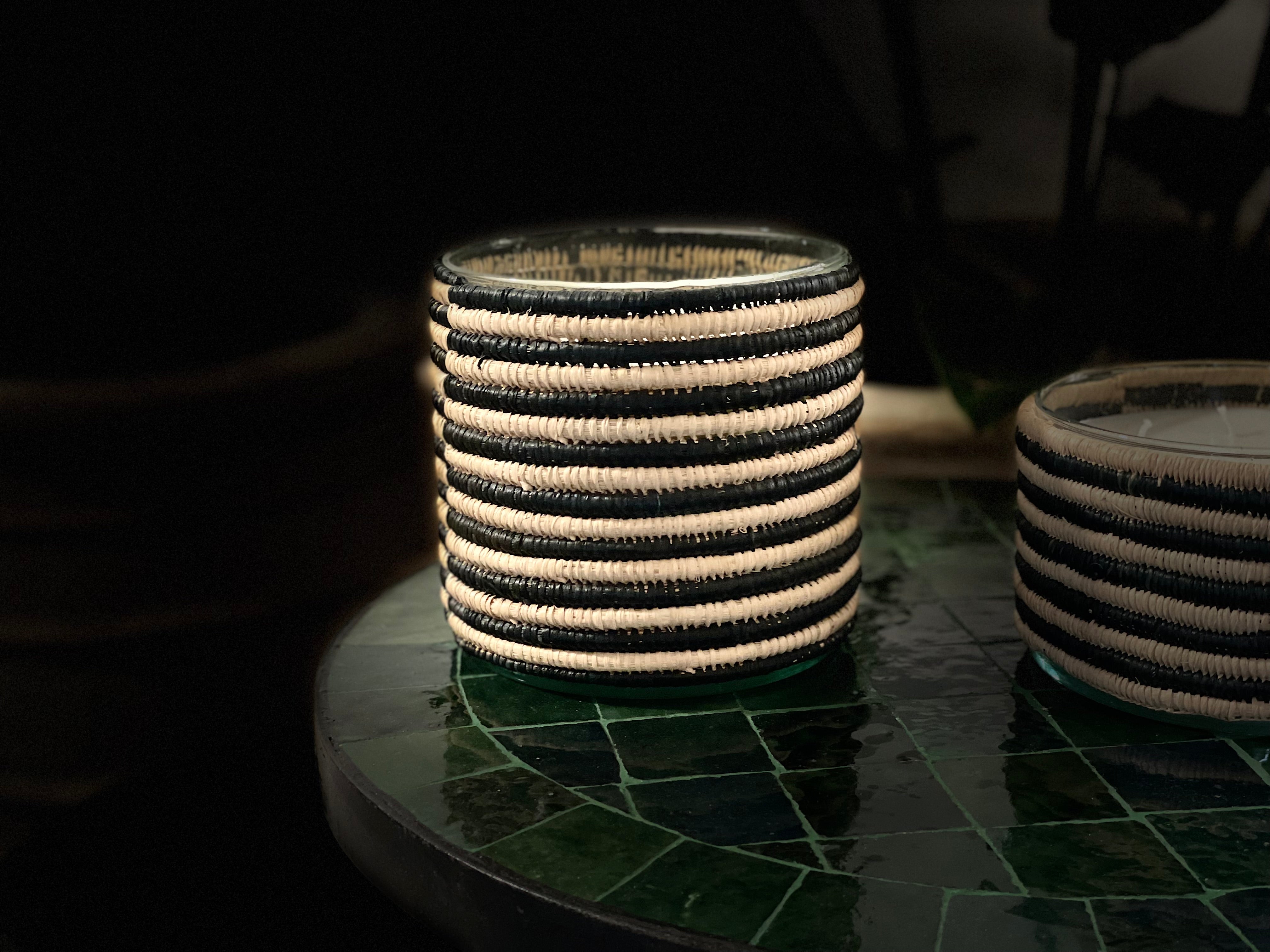Deze geurkaars is een karakterstuk dat warmte en vakmanschap samenbrengt. De pot is vervaardigd uit glas. De kaars is gewikkeld in handgeweven raffia met een streeppatroon in naturel en zwart.