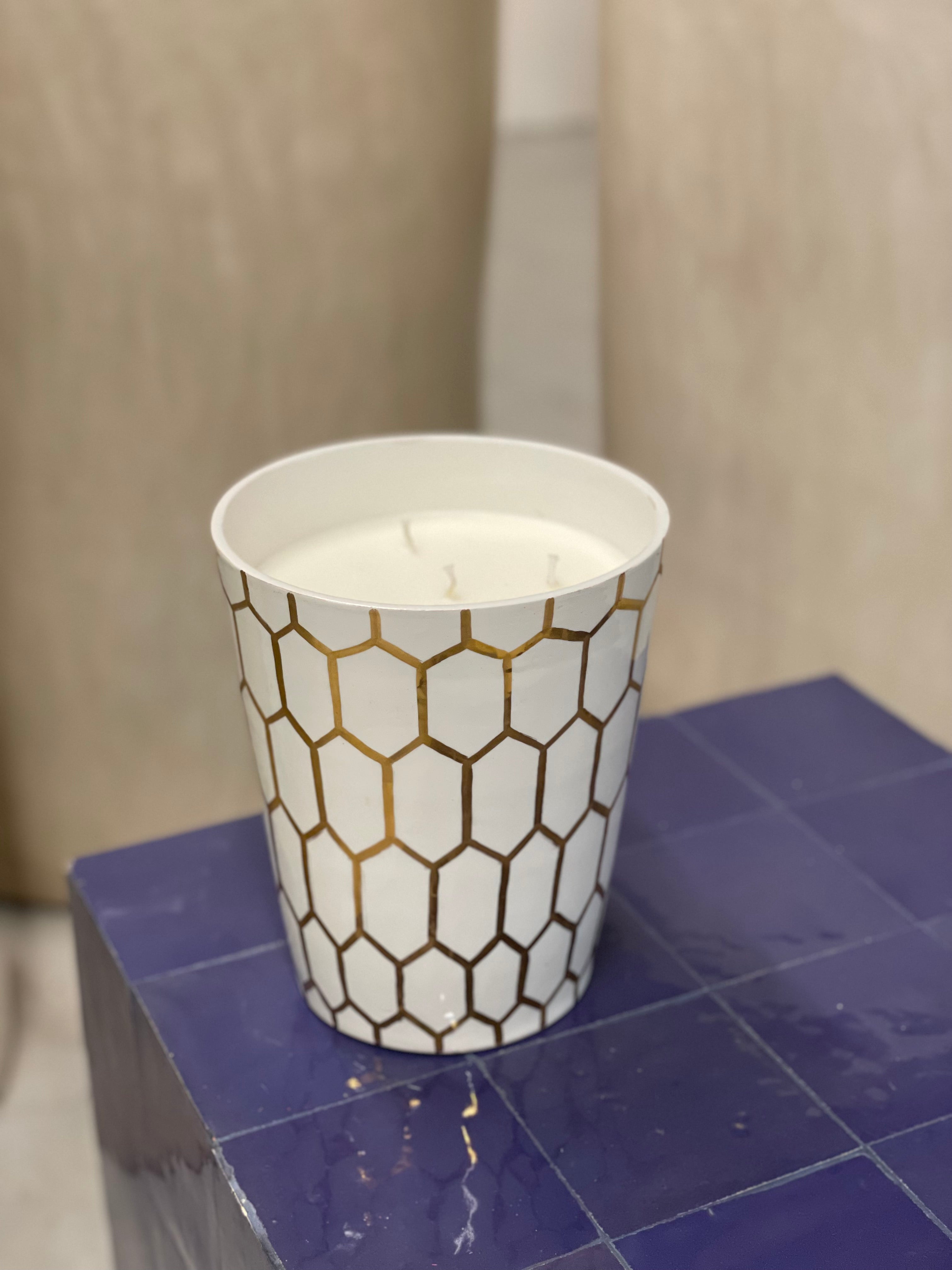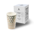 Deze geurkaars is een karakterstuk dat warmte en vakmanschap samenbrengt. De pot is vervaardigd uit keramiek. De kaars is afgewerkt met het motief van een bijennest geschilderd in bladgoud. Elke kaars is met de hand geschilderd.