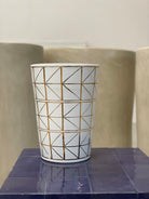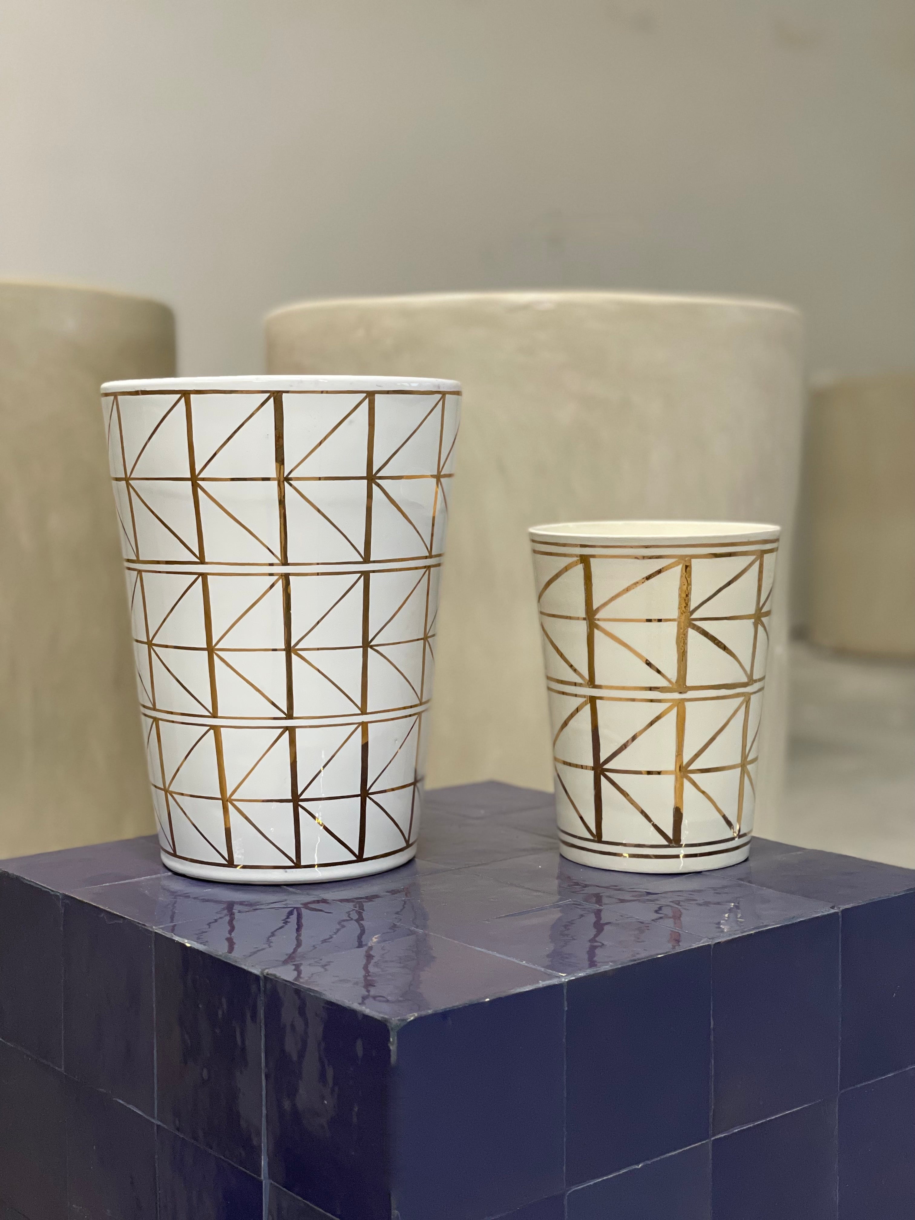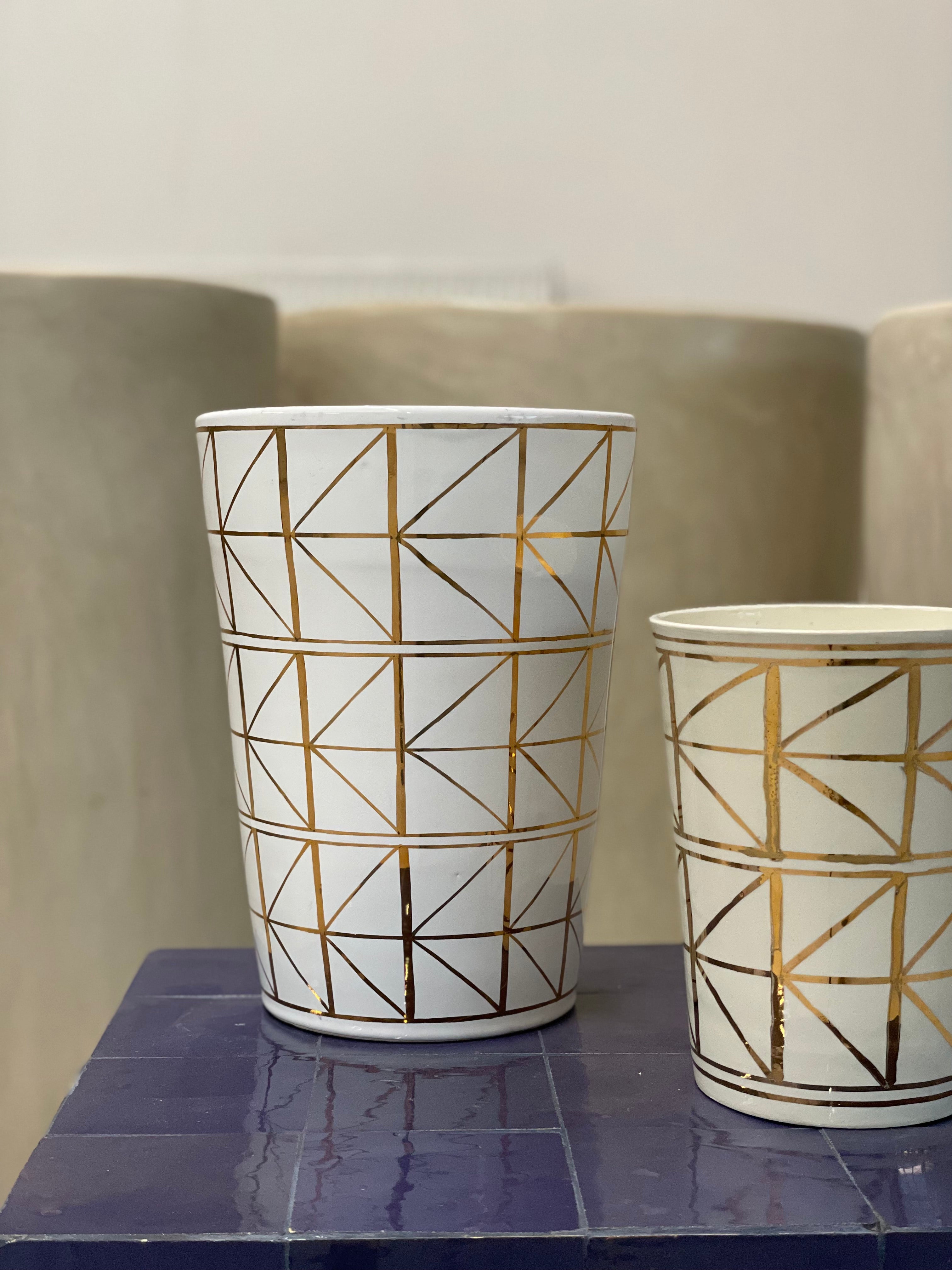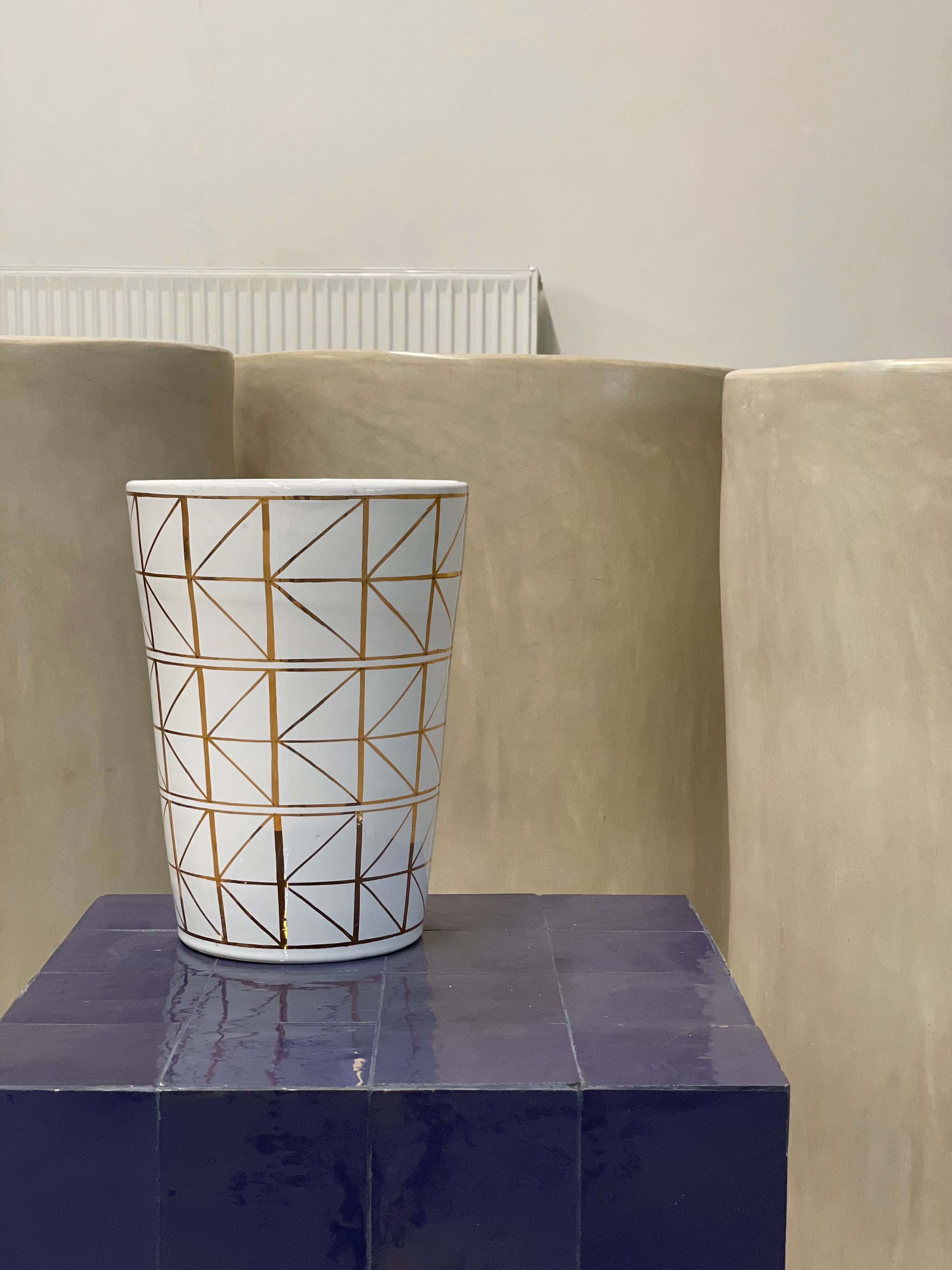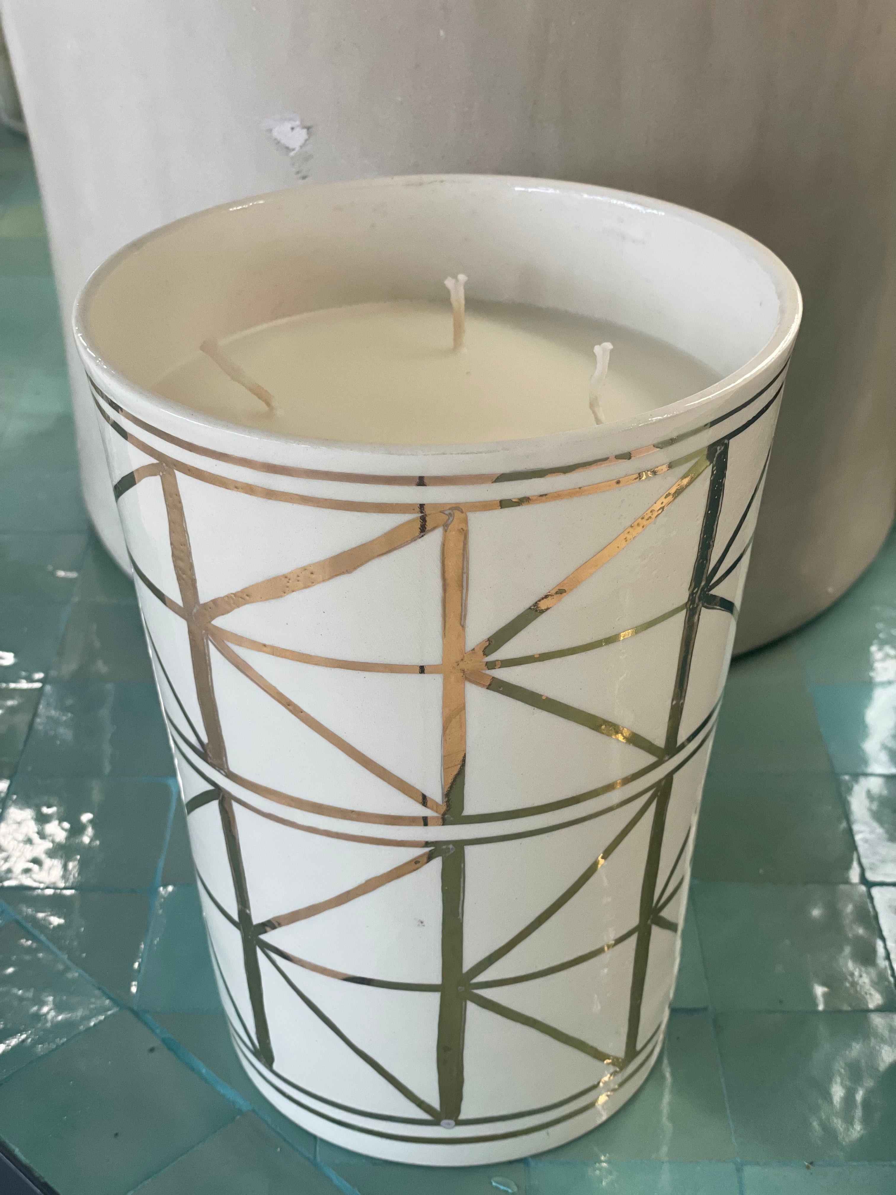Deze geurkaars is een karakterstuk dat warmte en vakmanschap samenbrengt. De pot is vervaardigd uit keramiek. De kaars is afgewerkt met een geometrisch motief, geïnspireerd op de Eiffeltoren, geschilderd in bladgoud. Elke kaars is met de hand geschilderd.
