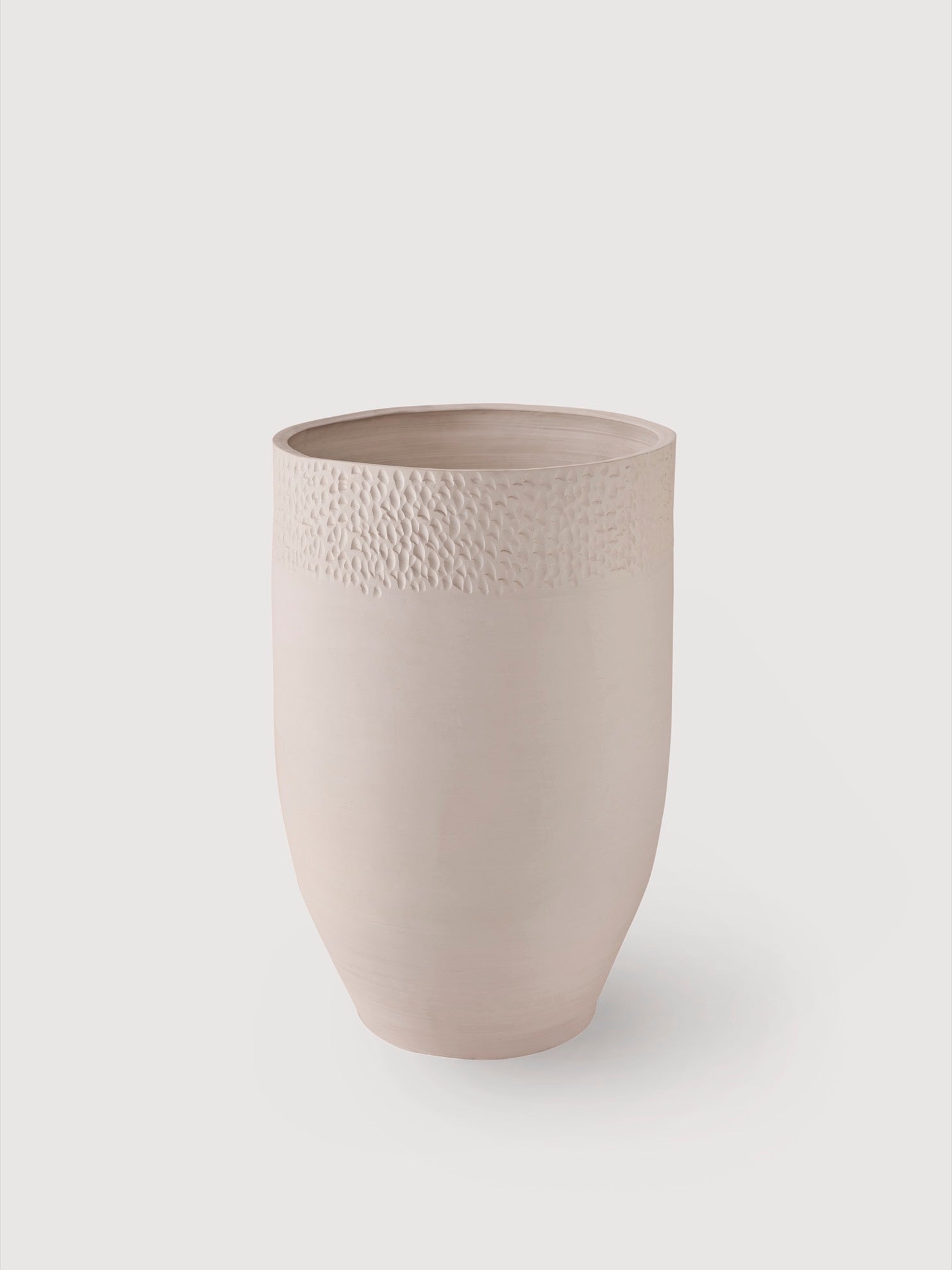 Farida est réalisée en terre cuite et finie avec une peinture à la chaux blanche mate.