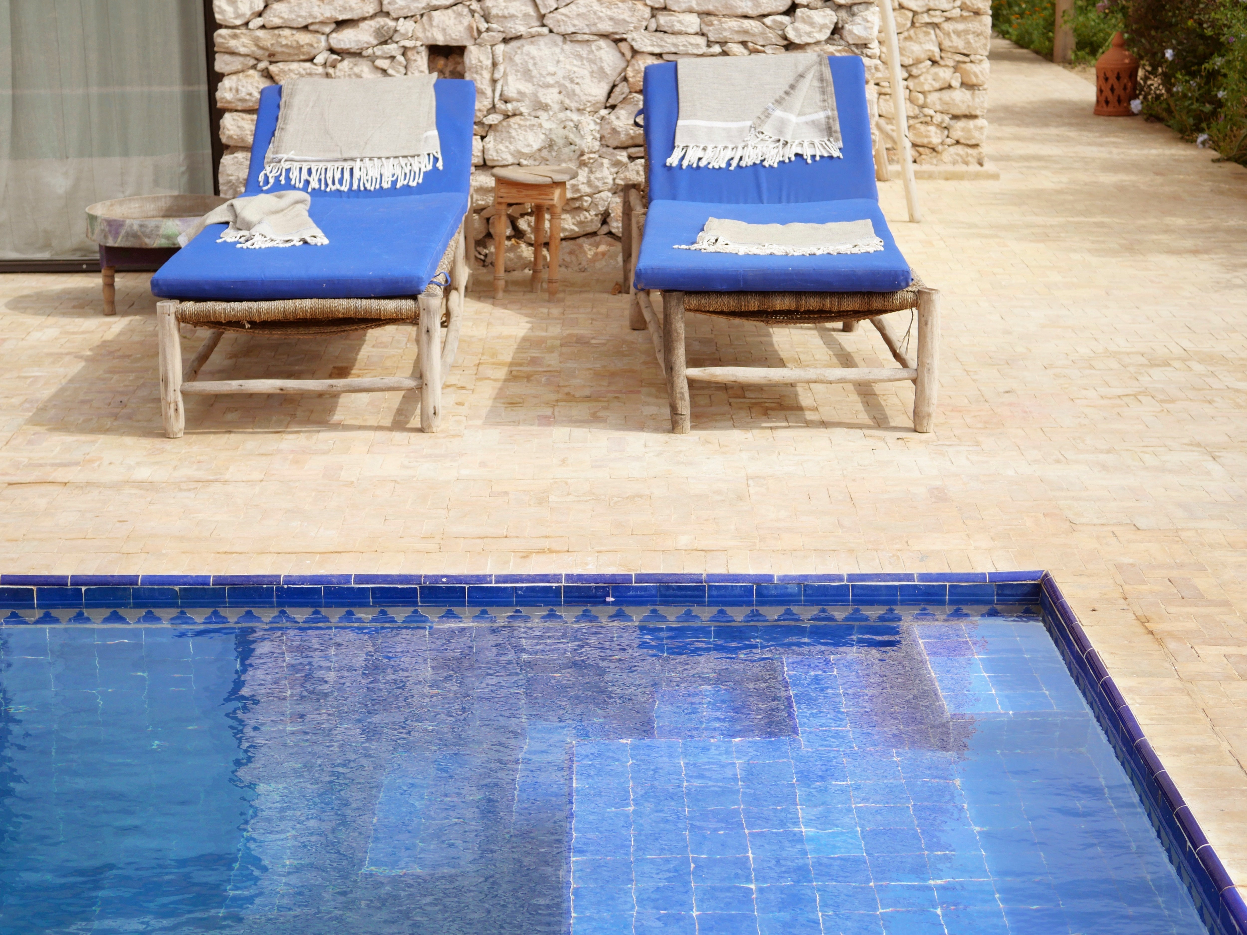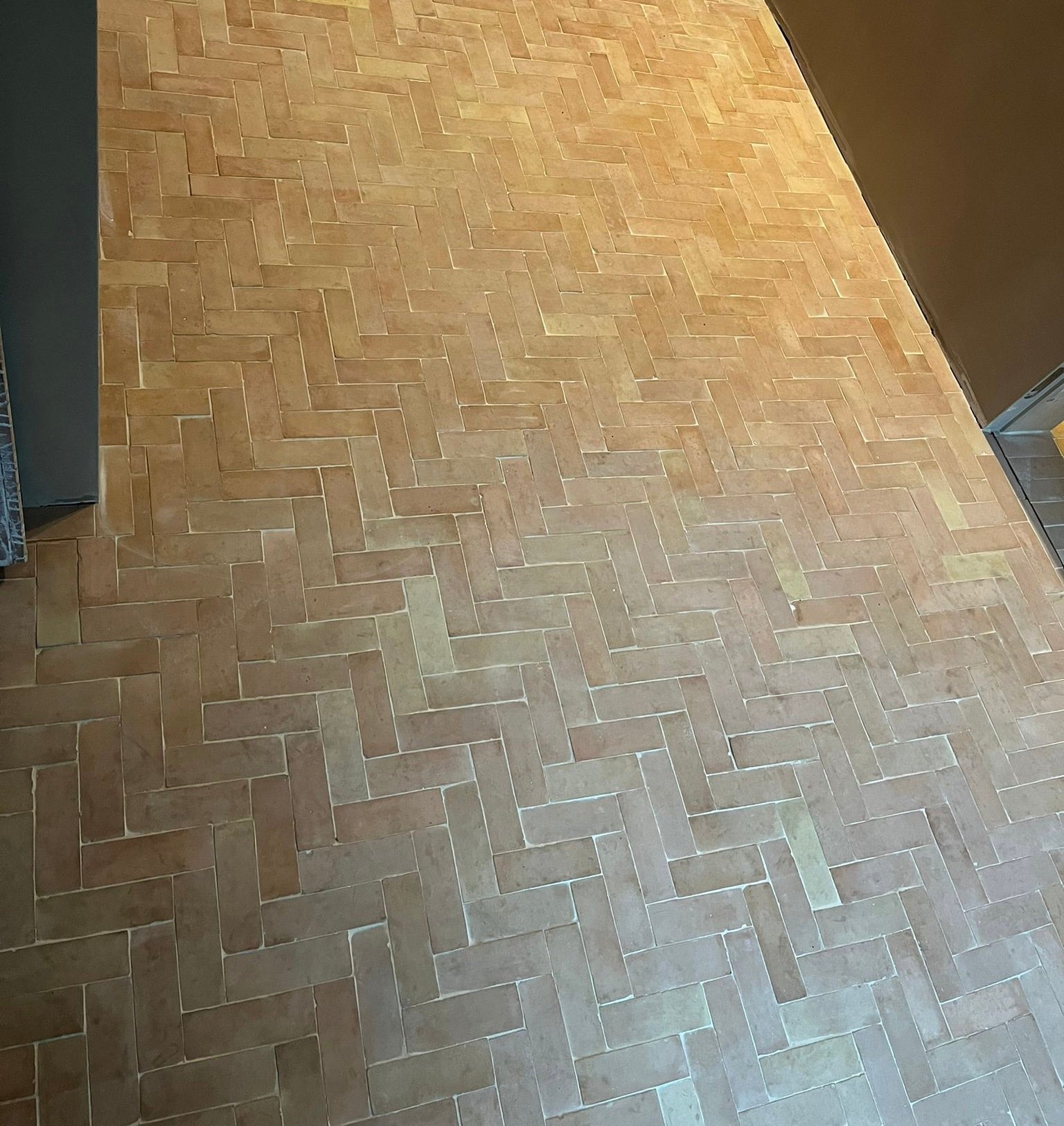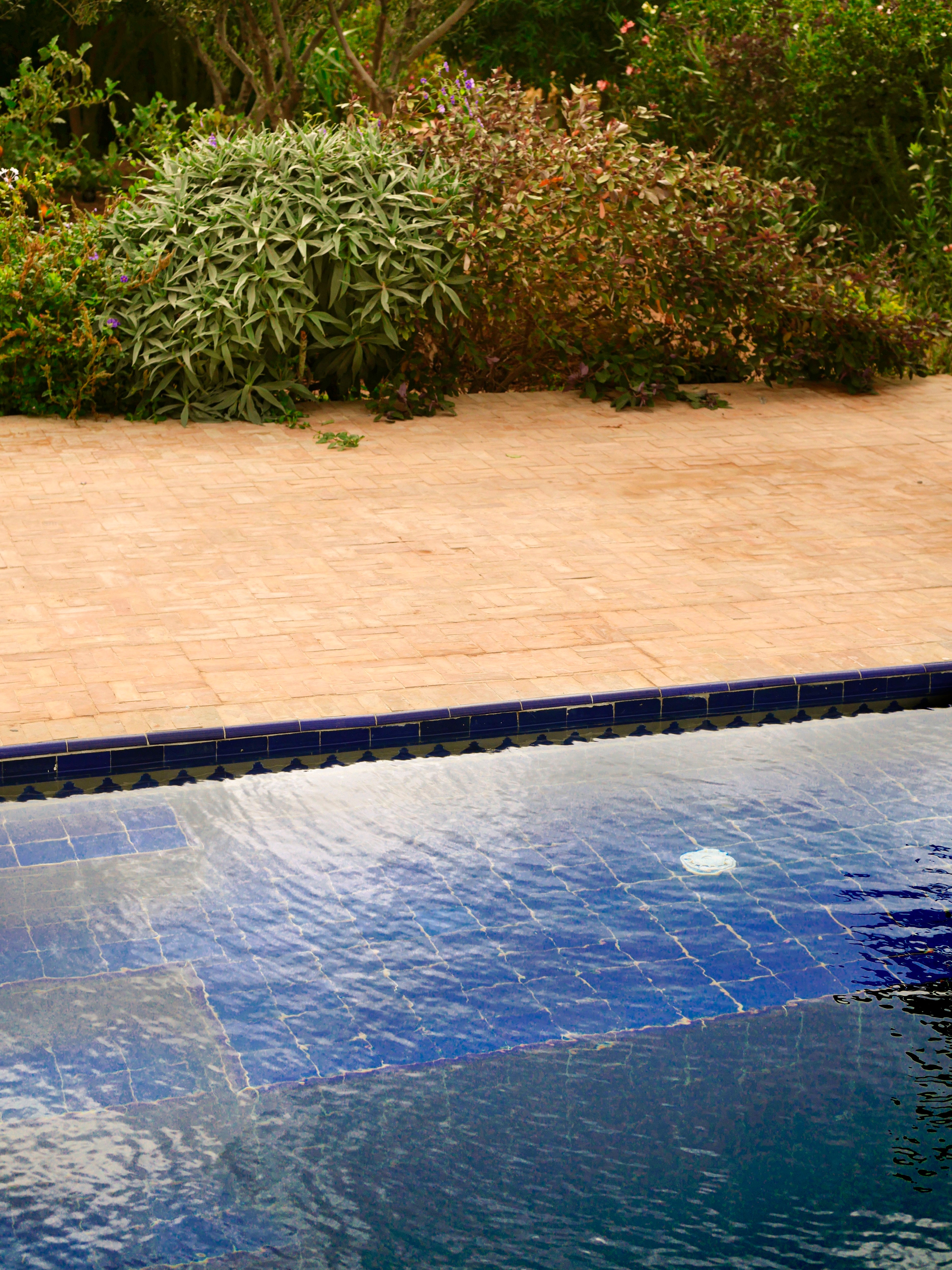 De vloer van dit poolhouse is afgewerkt met bejmats "brut naturel". Deze handgevormde terracotta tegels hebben een lichte variatie in kleur en textuur, wat zorgt voor een natuurlijke en authentieke uitstraling. Perfect geschikt voor warme, zuiderse sferen – binnen én buiten.