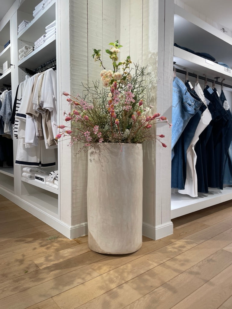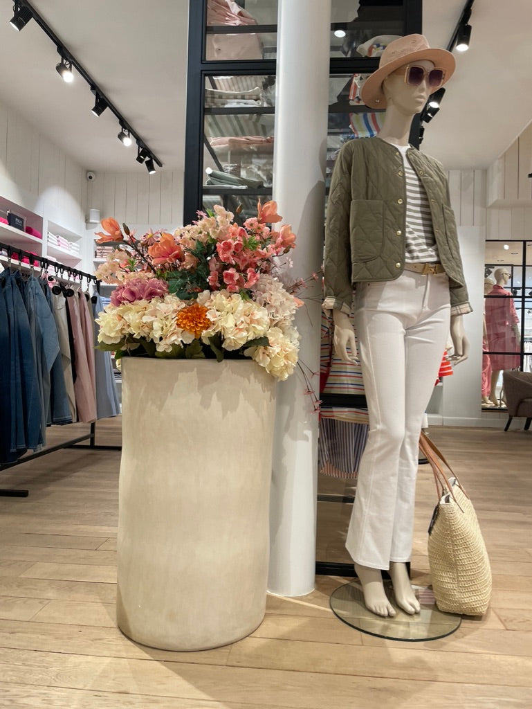Grote potten in tadelakt geven deze kledingwinkel een tijdloze uitstraling.